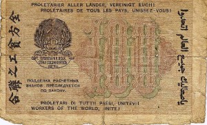 Девиз «Пролетарии всех стран, соединяйтесь!» на них напечатан на русском и повторен на шести иностранных языках – немецком, французском, итальянском, китайском, английском и арабском. В этот период Советское правительство проводило преустройство экономики, заключавшееся в отрешении от прежних капиталистических взаимоотношений в производстве и в конечном счете устранении влияния денег. Обмен промышленных товаров на сельскохозяйственную продукцию должен был совершаться в натуральной форме. Отменялись все денежные налоги, а также оплата за предоставление всякого рода государственных услуг (транспортных, городского хозяйства). К 1920 году 93% заработной платы выдавалось рабочим и служащим товарами первой необходимости и только 7% – денежными знаками. Была введена продразверстка.